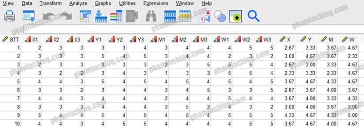 Trên cơ sở đó, tiến hành tính giá trị trung bình của các biến quan sát thuộc từng thang đo nhằm tạo ra bốn biến tổng hợp đại diện cho các biến tiềm ẩn X, Y, M và W. Những biến tổng hợp này sau đó được sử dụng làm dữ liệu đầu vào cho phân tích mô hình moderated mediation bằng PROCESS Macro trên SPSS.