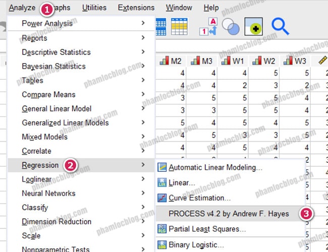 Trên giao diện SPSS, người nghiên cứu truy cập Analyze → Regression → PROCESS v4.2 by Andrew F. Hayes để mở hộp thoại phân tích.