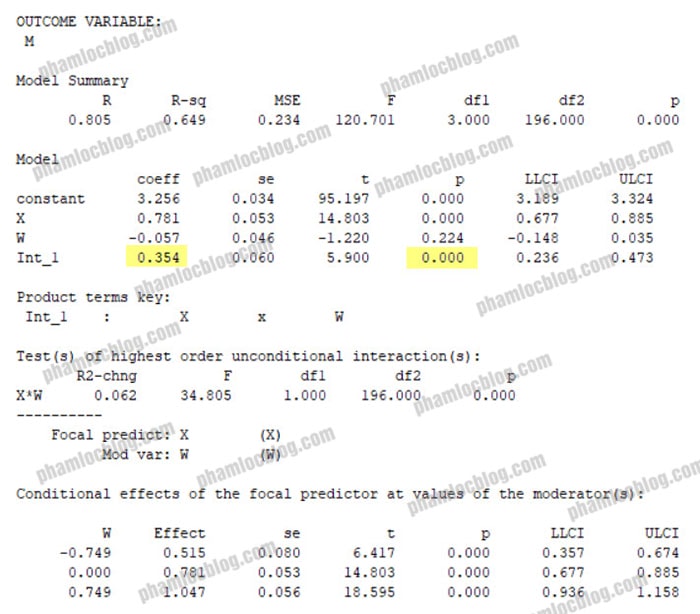 - Ngược lại, nếu khoảng tin cậy chứa giá trị 0, thì không có đủ bằng chứng thống kê để khẳng định sự tồn tại của moderated mediation, bất kể các hệ số tương tác điều tiết (ví dụ X×W) trong mô hình có đạt ý nghĩa thống kê hay không. Nói cách khác, ý nghĩa của quan hệ điều tiết riêng lẻ không quyết định ý nghĩa của moderated mediation.